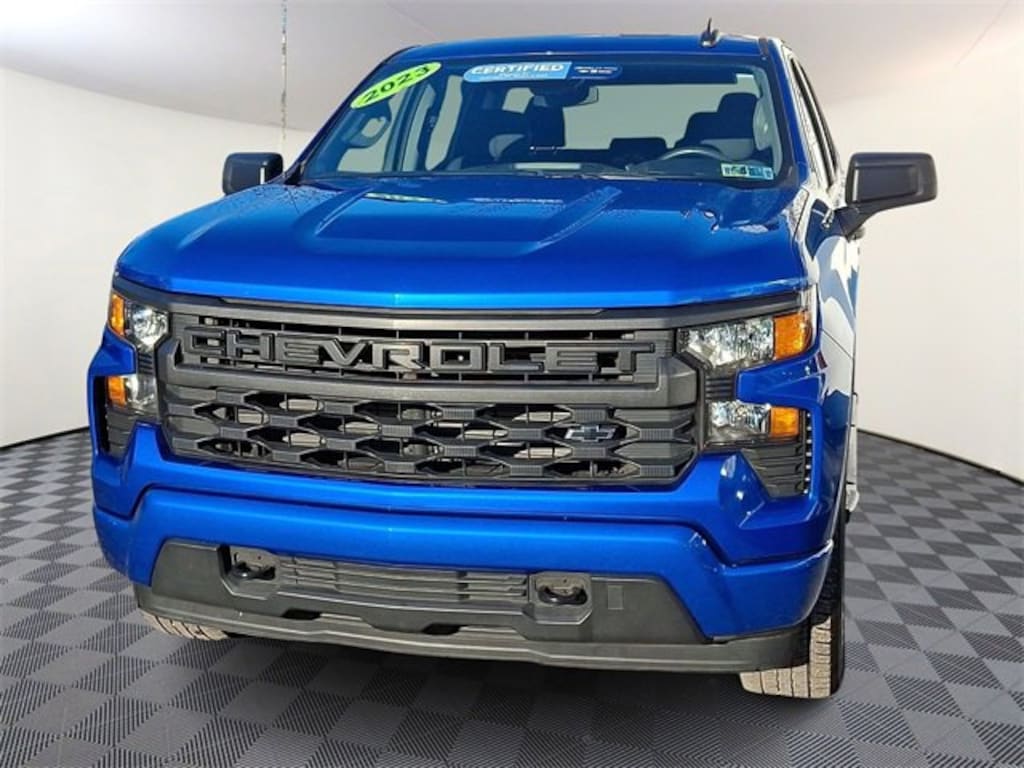 2023 Chevrolet Silverado 1500 Custom Glacier Blue Metallic 4D Crew Cab 4WD Chevrolet Certified Pre-Owned Certified, 8-Speed Automatic, 4WD, Black Cloth, 10-Way Power Driver Seat w/Lumbar, 120-Volt Bed Mounted Power Outlet, 120-Volt Instrument Panel Power Outlet, 3.5 Monochromatic Display Driver Info Center, 6-Speaker Audio System, 6 Rectangular Black Tubular Assist Steps (LPO), Apple CarPlay/Android Auto, Black Name Plates (LPO), Bluetooth® For Phone, Chevrolet Connected Access Capable, Color-Keyed Carpeting Floor Covering, Compass, Custom Convenience Package, Custom Value Package, Dark Essentials Package (LPO), Deep-Tinted Glass, Dual Rear USB Ports (Charge Only), Electric Rear-Window Defogger, Electrical Steering Column Lock, Electronic Cruise Control, EZ Lift Power Lock & Release Tailgate, Front Frame-Mounted Black Recovery Hooks, Front Rubberized Vinyl Floor Mats, HD Rear Vision Camera, High Capacity Suspension Package, Hitch Guidance, LED Cargo Area Lighting, Manual Tilt Wheel Steering Column, OnStar & Chevrolet Connected Services Capable, Power Front Windows w/Driver Express Up/Down, Power Front Windows w/Passenger Express Down, Power Rear Windows w/Express Down, Preferred Equipment Group 1CX, Premium audio system: Chevrolet Infotainment 3, Rear 60/40 Folding Bench Seat (Folds Up), Rear Rubberized-Vinyl Floor Mats, Remote Keyless Entry, Remote Vehicle Starter System, SiriusXM Radio, Standard Tailgate, Theft Deterrent System (Unauthorized Entry), Trailering Package, Wheels: 20 x 9 Bright Silver Painted Aluminum, Wi-Fi Hot Spot Capable, Wireless Phone Projection, 3.42 Rear Axle Ratio, 4-Wheel Disc Brakes, 40/20/40 Front Split-Bench Seat, 6 Speakers, ABS brakes, Air Conditioning, Alloy wheels, AM/FM radio: SiriusXM, Auto High-beam Headlights, Auto-Locking Rear Differential, Automatic Emergency Braking, Black Tailgate CHEVROLET Lettering (LPO), Brake assist, Bumpers: body-color, Chevytec Spray-On Black Bedliner, Cloth Seat Trim, Delay-off headlights, Driver door bin, Driver vanity mirror, Dual front impact airbags, Dual front side impact airbags, Electronic Stability Control, Following Distance Indicator, Forward Collision Alert, Front anti-roll bar, Front Black Bowtie Emblem (LPO), Front Center Armrest w/Storage, Front License Plate Kit, Front Pedestrian Braking, Front reading lights, Front wheel independent suspension, Fully automatic headlights, Heated door mirrors, Illuminated entry, IntelliBeam Automatic High Beam On/Off, Lane Keep Assist w/Lane Departure Warning, Low tire pressure warning, Not Equipped w/Functional Cab & Bed Power Outlets, Not Equipped w/Rear USB Ports, Not Equipped w/Steering Column Lock, Occupant sensing airbag, Outside temperature display, Overhead airbag, Overhead console, Panic alarm, Passenger door bin, Passenger vanity mirror, Power door mirrors, Power driver seat, Power steering, Power windows, Radio data system, Radio: Chevrolet Infotainment 3 System, Rear reading lights, Rear step bumper, Rear window defroster, Remote keyless entry, Security system, Speed control, Speed-sensing steering, Split folding rear seat, Tachometer, Tilt steering wheel, Traction control, Trip computer, Underseat Storage (LPO), Variably intermittent wipers, Voltmeter, 8-Speed Automatic, 4WD, Black Cloth, 10-Way Power Driver Seat w/Lumbar, 120-Volt Bed Mounted Power Outlet, 120-Volt Instrument Panel Power Outlet, 3.5 Monochromatic Display Driver Info Center, 6-Speaker Audio System, 6 Rectangular Black Tubular Assist Steps (LPO), Apple CarPlay/Android Auto, Black Name Plates (LPO), Bluetooth® For Phone, Chevrolet Connected Access Capable, Color-Keyed Carpeting Floor Covering, Compass, Custom Convenience Package, Cust